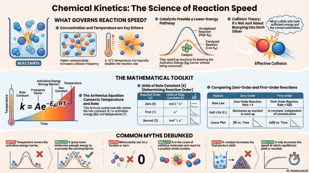 This guide breaks down the mathematics of reaction rates, comparing Average and Instantaneous speeds while distinguishing experimental Order from theoretical Molecularity. From deriving Integrated Rate Equations for Zero and First Order reactions to calculating Activation Energy using the Arrhenius formula, these sections provide the specific tools needed for board exams.